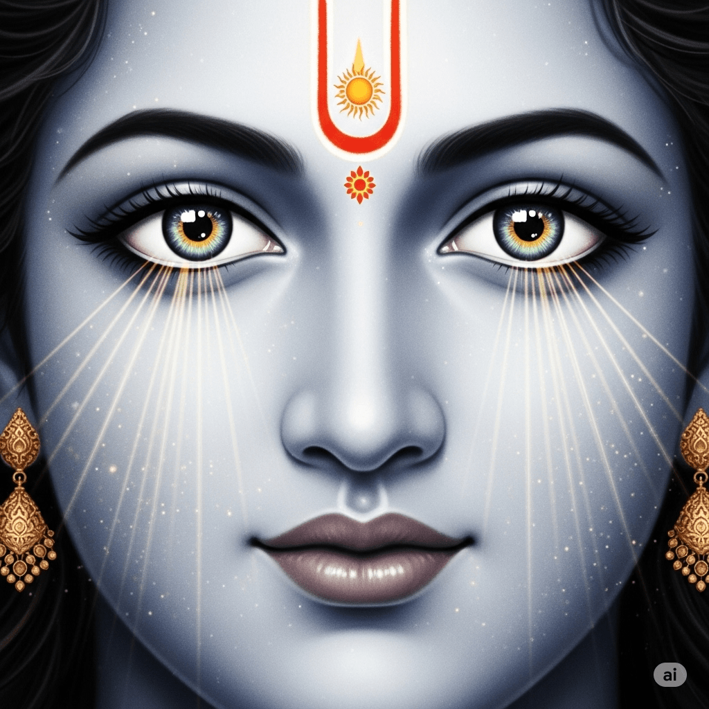 21.) Surrounded by profound darkness, when the Cosmic Being (Virāṭ Puruṣa) felt inclined to see, a pair of eyes manifested within Him, accompanied by the radiant sun-god—the divine presiding deity of sight—and the very sense of vision itself. From this sacred awakening arose the perception of colors, the resplendent objects of His divine gaze.