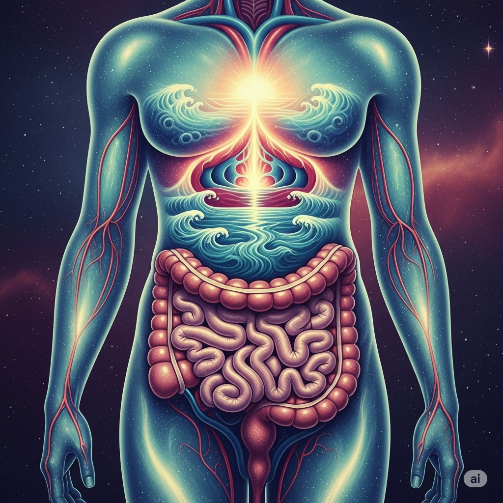 29.) When the Cosmic Being, stirred by the desire to partake of nourishment and sustenance, manifested within Himself the sacred cavity of the abdomen, along with the intestines and the vast network of veins and arteries. In union with these arose the divine rivers and the mighty seas, each presiding over as their guardian deities. Thus came forth satisfaction—born of the intestines and the seas—and nourishment, flowing through the veins and arteries like sacred rivers, sustaining the cosmic form through their ordained functions, upheld by divine grace.