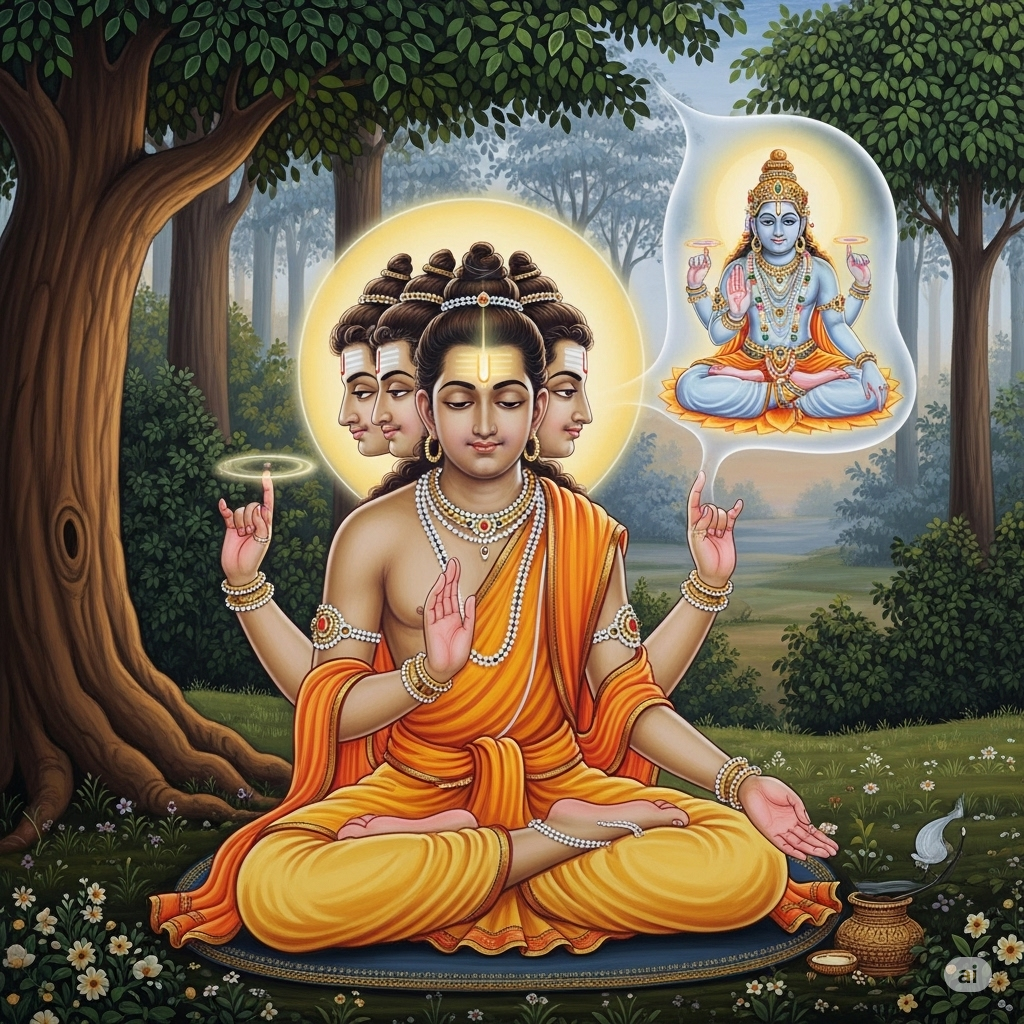 After the disappearance of the Lord Almighty from his vision, Brahmā, the lotus-born Creator, contemplated the task of recreating the universe. Filled with reverence and devotion, he performed severe austerities for a hundred celestial years, with his mind absorbed in thoughts of Śrī Nārāyaṇa, the Supreme Being, whose glories surpass all material comprehension. By this penance, Brahmā’s knowledge and creative power were magnified, allowing him to perceive the entire cosmos as if resting upon the lotus from which he emerged. Witnessing the tumult of wind and water during the period of dissolution, he prepared to manifest creation once more, guided by the instructions of the Lord Himself. In this way, Brahmā’s actions, though vast and powerful, were an expression of divine grace, serving the ultimate purpose of sustaining souls and the cosmic order.