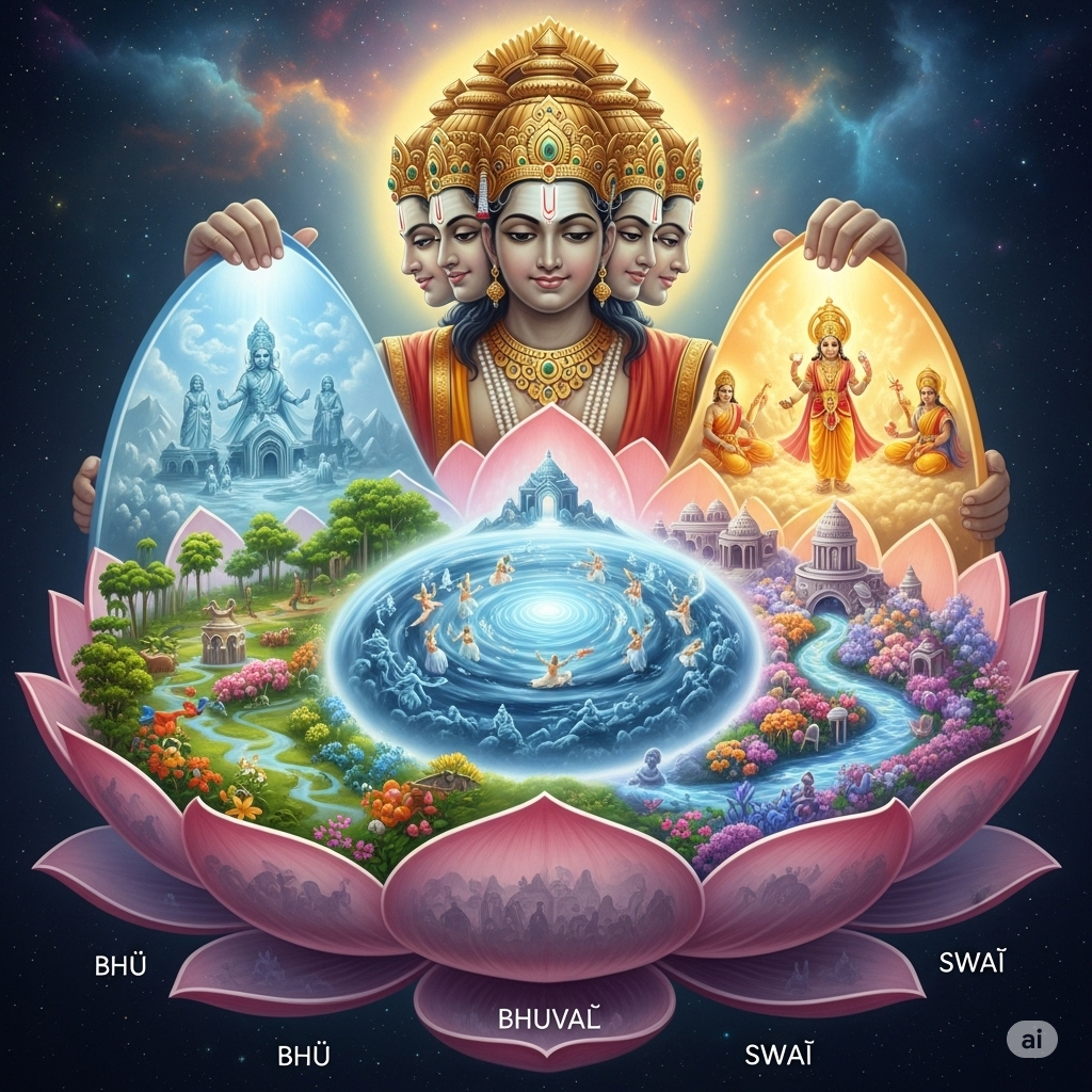 A4: The lotus on which Brahmā sat pervaded all space. By entering the corolla and splitting it into three parts—Bhūḥ, Bhuvaḥ, and Swaḥ—he created the three worlds where embodied souls experience the fruits of their karma. His own abode (Satyaloka) and the higher worlds (Maharloka, Janaloka, Tapoloka) were for those performing selfless virtuous actions.