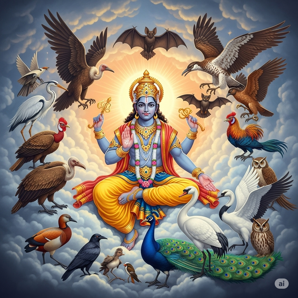 - Birds: heron, vulture, bat, hawk, peacock, swan, crane, crow, owl, ruddy goose, etc.