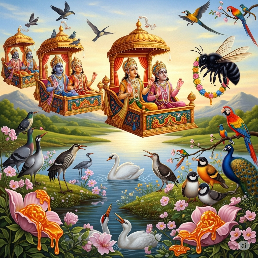 18. There the loud confusing cries of birds like pigeons, cuckoos, cranes, cakravāka, (the ruddy goose), cātakas, swans, parrots, tittiris and peacocks stop for a while when the chief black-bee (in Viṣṇu’s vanamālā) hums loudly as if singing the story of Hari.
