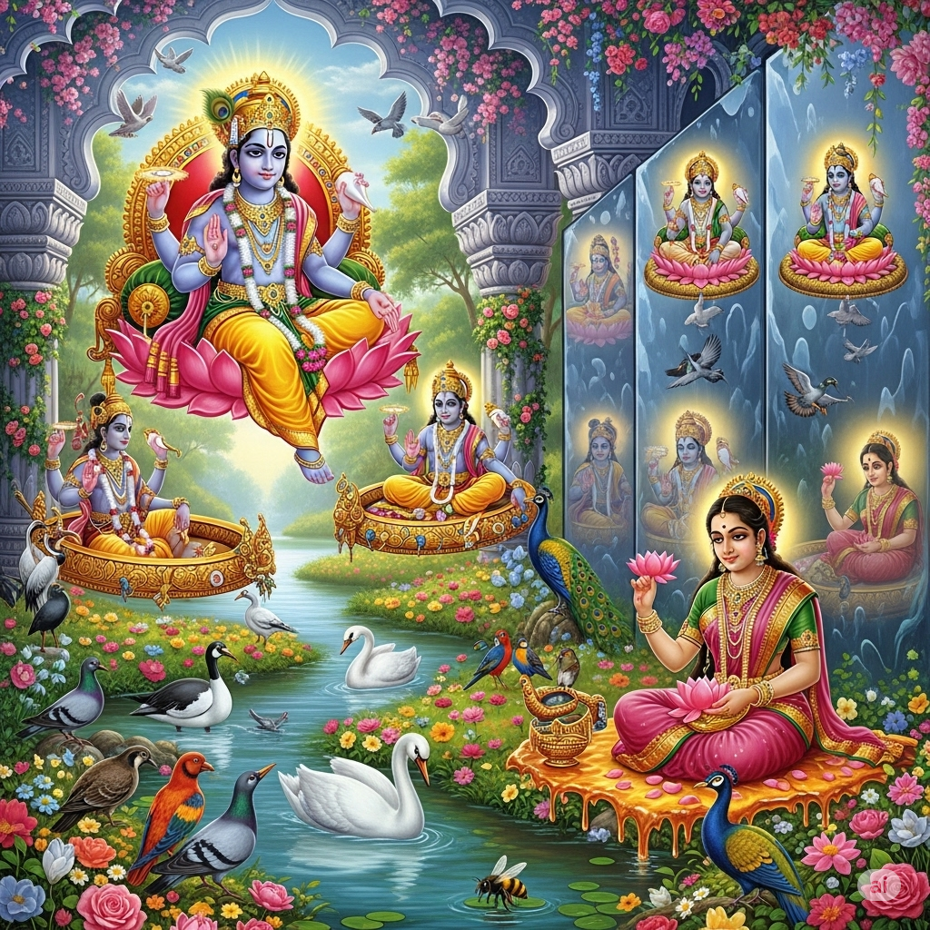 The chapter then takes the devotees into the resplendent realm of Vaikuṇṭha, the eternal abode of Hari, where all beings exist in pure, unsullied bliss. The sages observe the perfection of this divine realm, where the fragrant groves, wish-yielding trees, and ever-blooming flowers fill the atmosphere with nectarean beauty. Even the bees, birds, and other creatures participate in celebrating the glory of Bhagavān. Lakṣmī, the goddess of fortune, remains ever devoted, attending to Hari with unwavering love, showing that true devotion is free from vanity and attachment. Here, the chapter conveys that even celestial beings are humbled by the majesty of the Lord, and that all forms of beauty, wealth, and power are nothing in comparison to the bliss of pure bhakti.