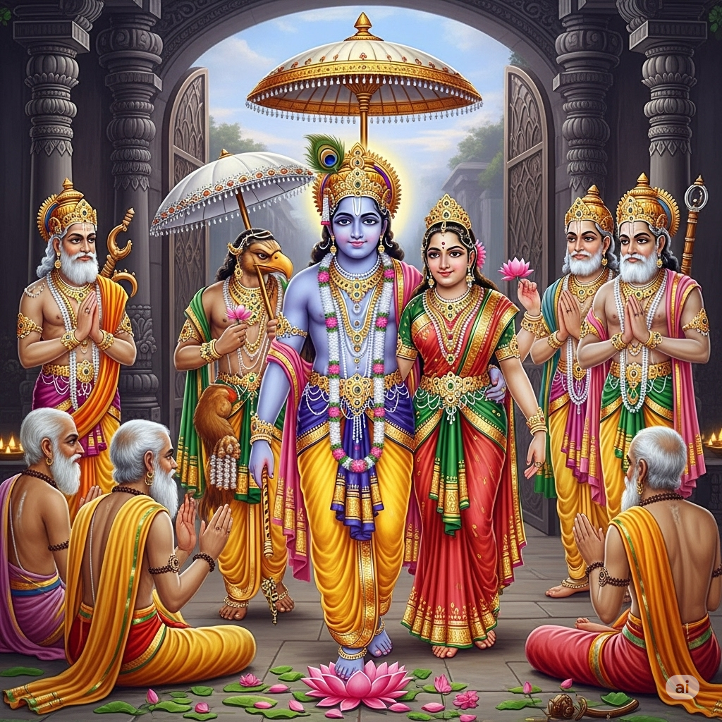 When Bhagavān himself manifests before the sages, accompanied by the graceful Lakṣmī, they behold his sublime form—resplendent, compassionate, and full of divine majesty. Every detail of his form, from the Kaustubha jewel on his chest to the delicate fragrance of Tulasī adorning his feet, fills their hearts with uncontainable bliss. They offer obeisances with deep love, recognizing that the Supreme Lord is both immanent in all beings and yet supremely transcendental. Their eyes, minds, and senses are enthralled, and through this vision, the sages experience the highest prema—the purest love for Bhagavān, which transcends fear, desire, and worldly attachments.