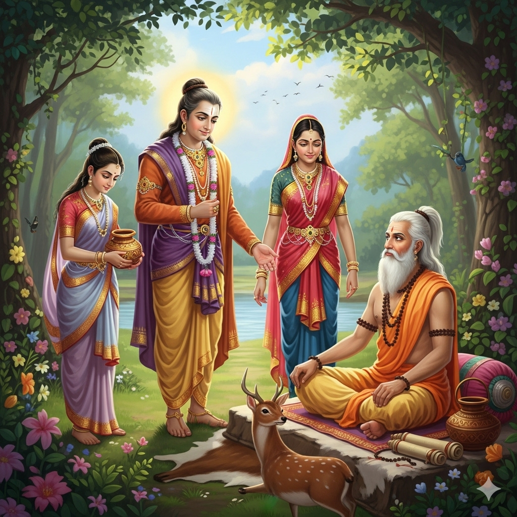 26–27.) Taking leave of the great sage with due reverence, the monarch mounted his chariot with his queen. Attended by his royal retinue, he journeyed towards his capital, beholding on both charming banks of the sacred Sarasvatī the hermitages of serene sages, who dwelt there in tranquillity and holiness.