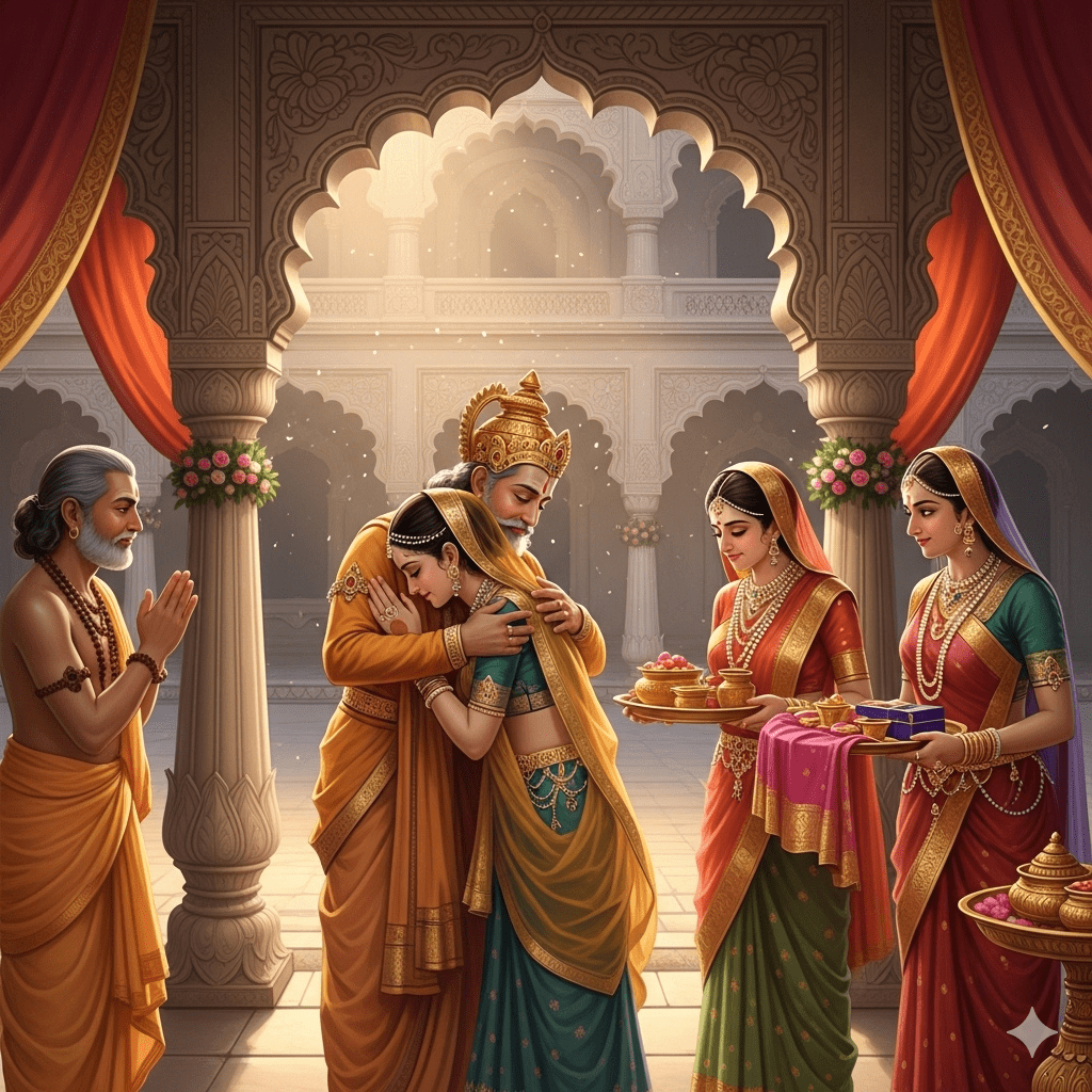 24.) Relieved of his anxieties, the emperor embraced his daughter—now entrusted to a worthy husband—with a heart overwhelmed by tender affection.