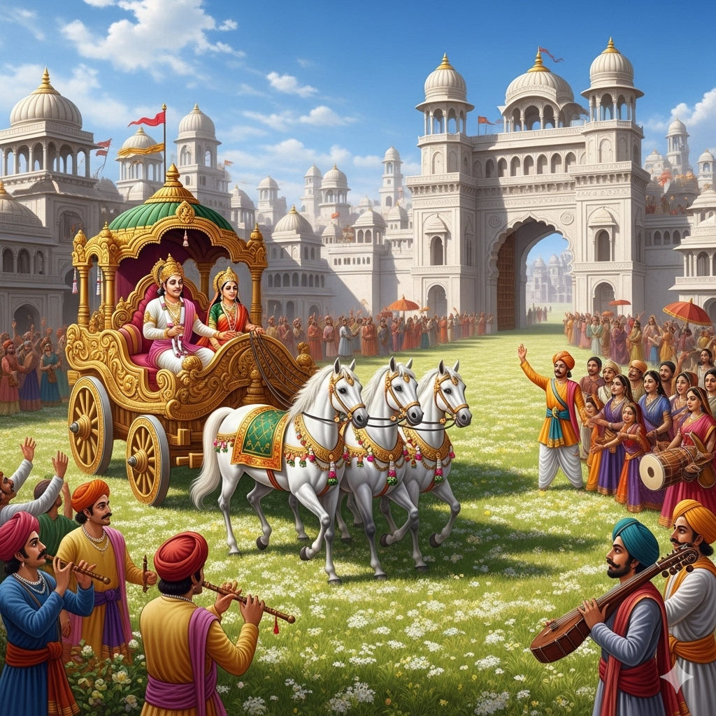 28.) Overjoyed at news of his return, the subjects of Brahmāvarta came forth to welcome their sovereign. With songs, praises, and the harmonious sounds of musical instruments, they greeted their beloved ruler.