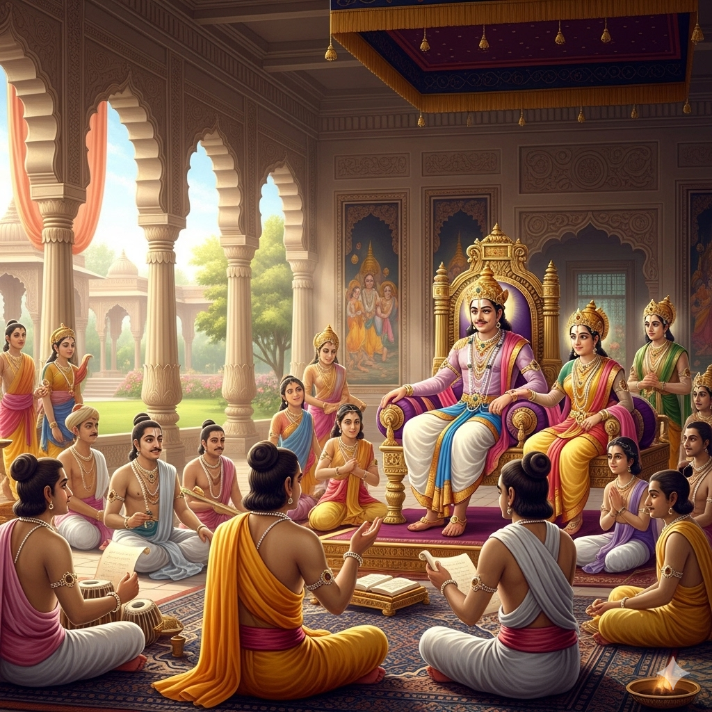 33.) There, in the company of his wife and children, he enjoyed sense-pleasures in harmony with dharma, never obstructing the higher goals of life—righteousness (dharma), prosperity (artha), and liberation (mokṣa). At dawn each day, celestial musicians with their consorts sang sweet praises of his noble deeds; yet the emperor’s heart delighted only in listening with love to the sacred narrations of Śrī Hari.