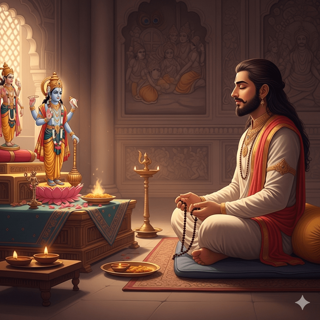 34.) Although Svāyambhuva Manu was a master in creating and arranging avenues of enjoyment, he was never ensnared by them, for his heart was anchored in devotion to Bhagavān and in deep contemplation of His presence.